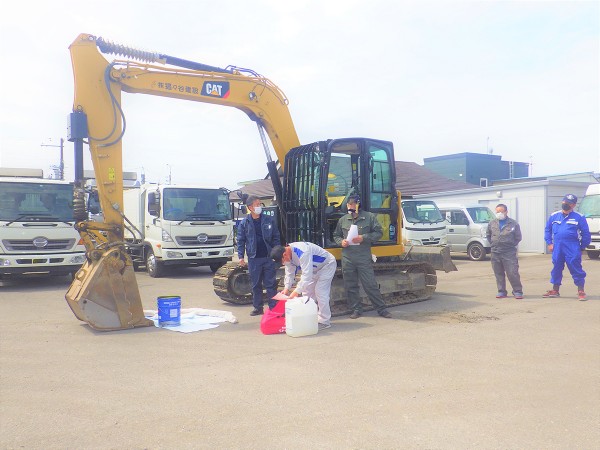 労働災害の防止策、運転マナーの基本、油の漏洩緊急事態テストでは実際にスピルキットを使用して訓練しました。